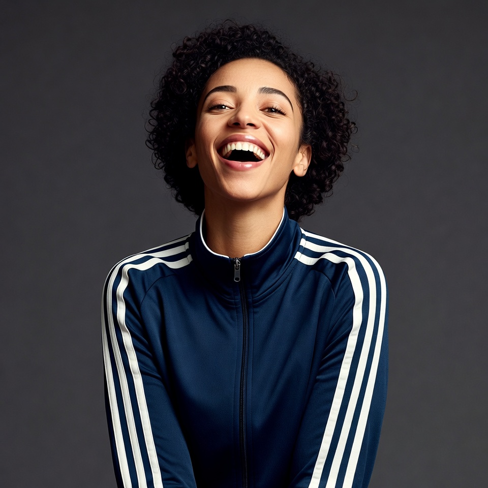 A young mixed-race woman with curly afro hair smiles widely and laughs joyfully against a dark gray background. She wears a navy blue Adidas zip-up jacket with white stripes on the sleeves and collar. Her face is tilted upward, showing bright eyes and white teeth.