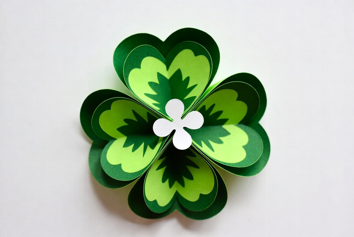 3D craft, St Patricks Day, flower craft, green clover, green paper, illustration, isolated background, layered paper, luck symbol, paper craft, papercraft, shamrock, white background, white veins, four-leaf clover