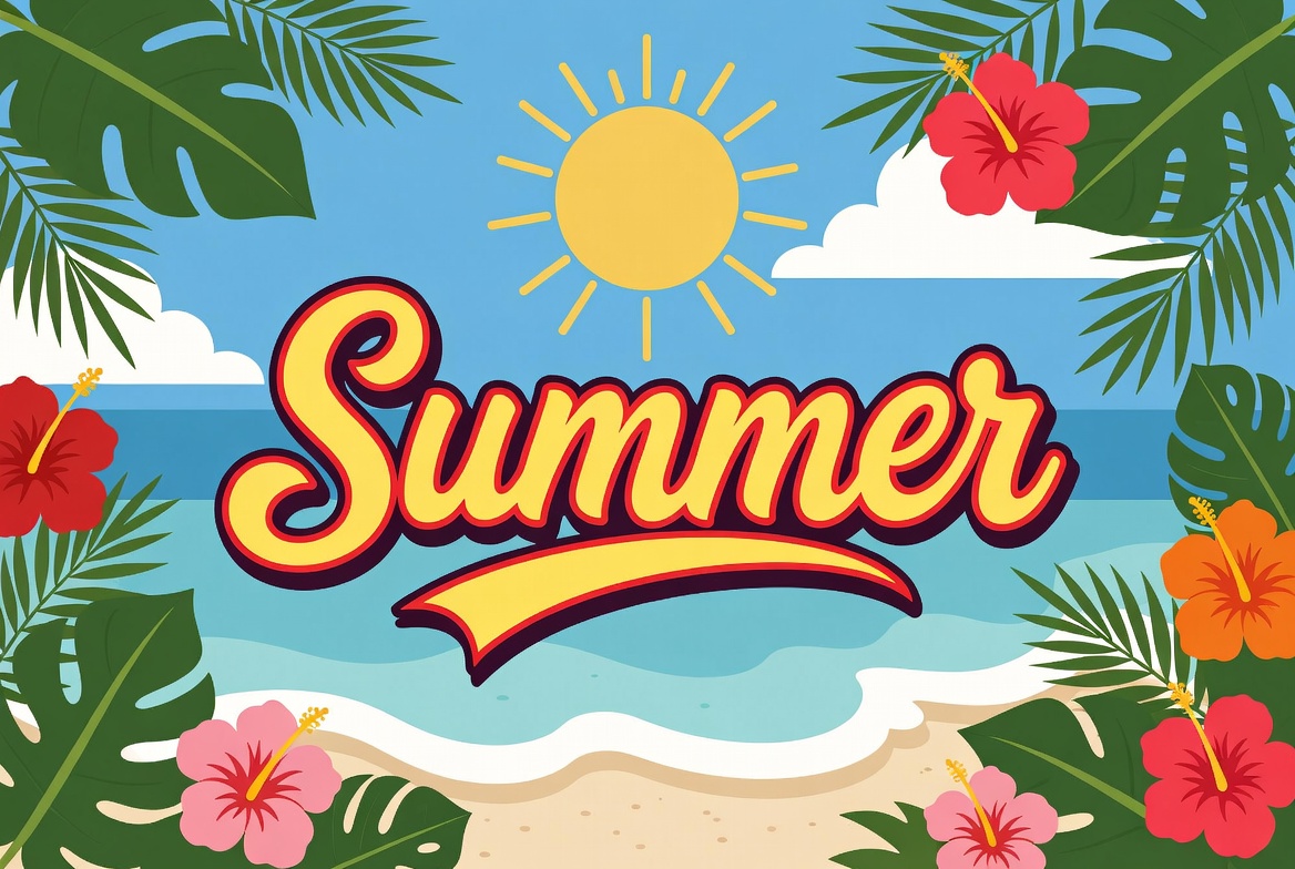 A vibrant illustration features the word 'Summer' in bold yellow retro font centered on a tropical beach scene. Surrounding it are green palm leaves, red hibiscus flowers, a bright sun, blue ocean waves, and white clouds. The background shows sandy beach and clear sky.