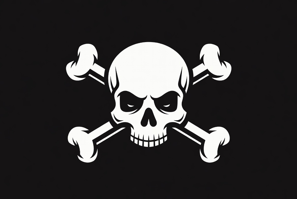 A white skull and crossbones symbol is prominently displayed on a solid black background. The skull features a menacing grin with sharp teeth and empty eye sockets. The crossed bones are positioned directly beneath the skull in a classic pirate flag design.