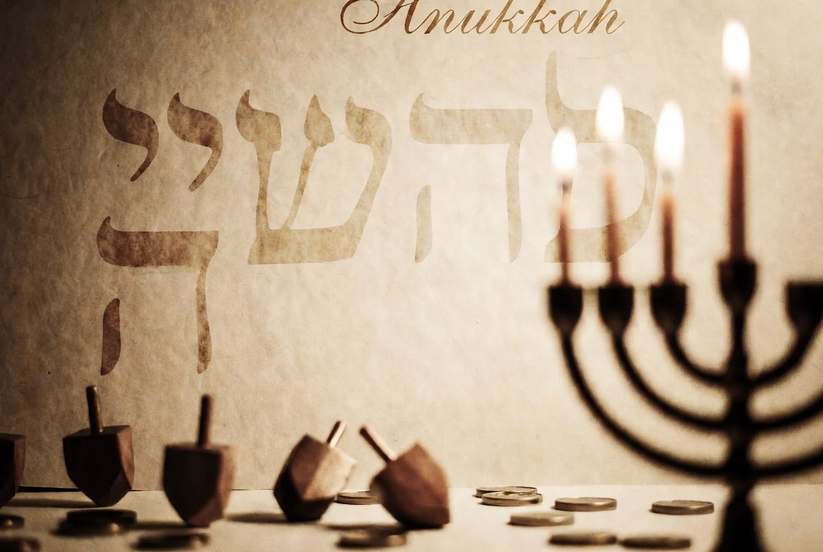 A Hanukkah menorah with lit candles stands in the foreground against a textured beige background. Hebrew text for Hanukkah and the English word 'Hanukkah' appear above. Scattered wooden dreidels and golden coins lie on the surface below.