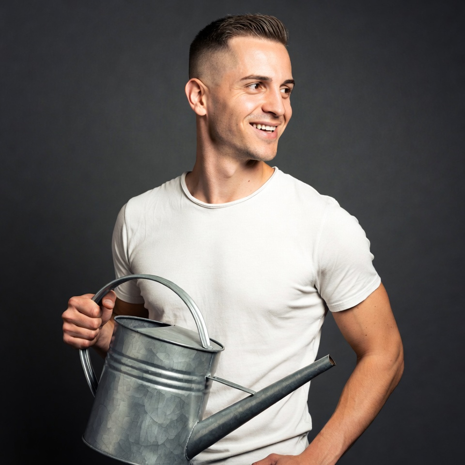 A young White man with short buzzed hair smiles while holding a metal watering can in his right hand. He wears a plain white t-shirt and stands against a dark gray background. His muscular build and side profile are prominently featured.