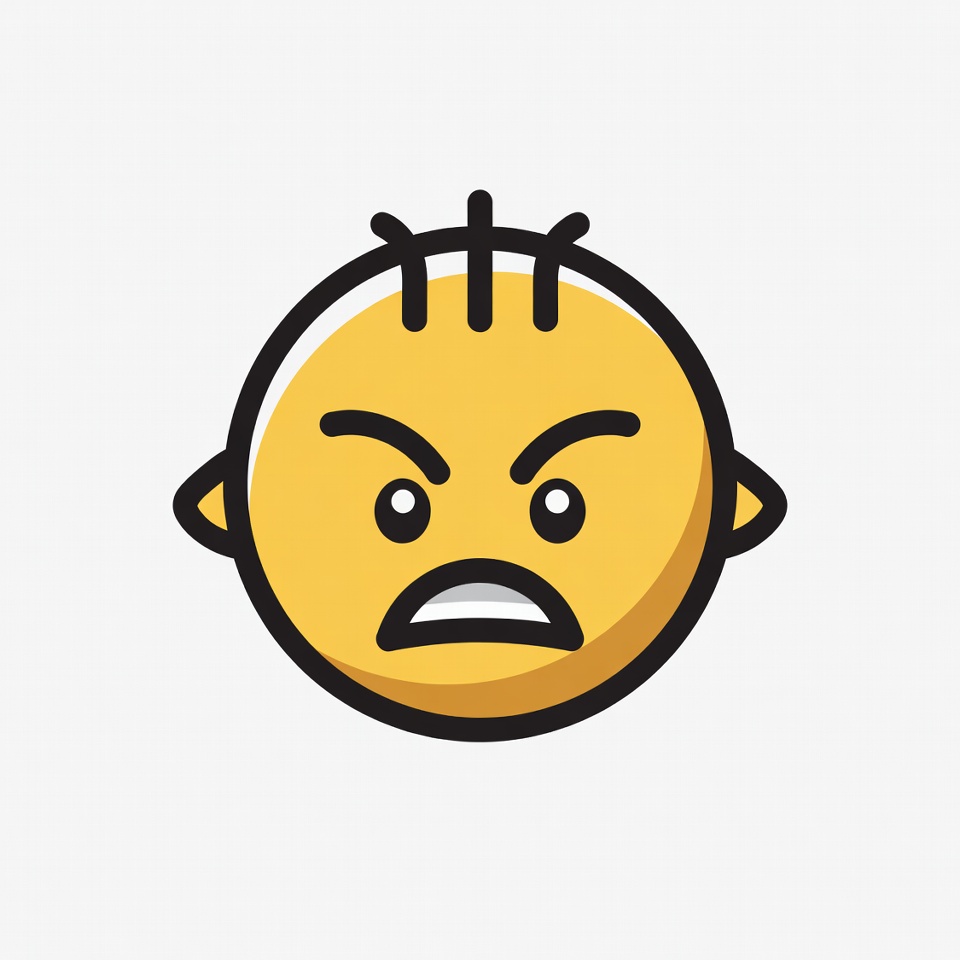 A yellow cartoon face with spiky hair and furrowed eyebrows shows an angry expression. The mouth is downturned in a scowl, and the eyes are narrowed. It features a simple line art style on an isolated white background.