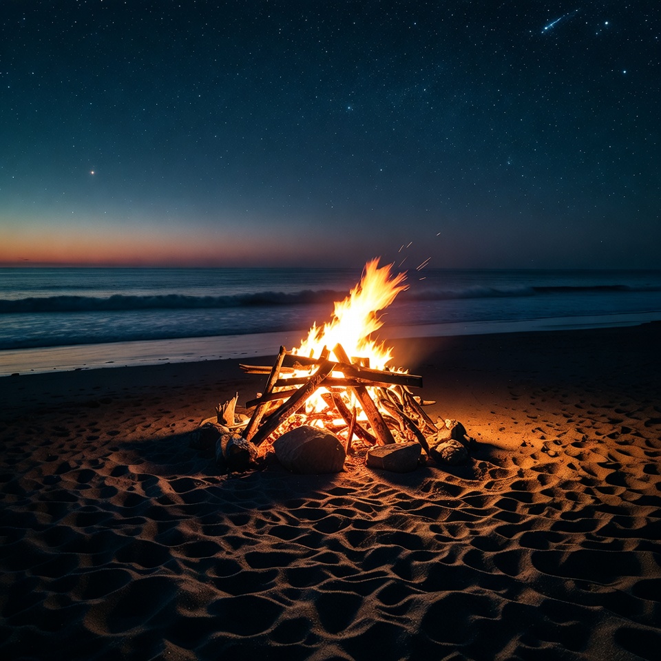 A vibrant bonfire burns on a sandy beach at night, surrounded by logs and rocks. Flames illuminate the sand with waves crashing nearby. A starry sky and twilight horizon frame the scene.