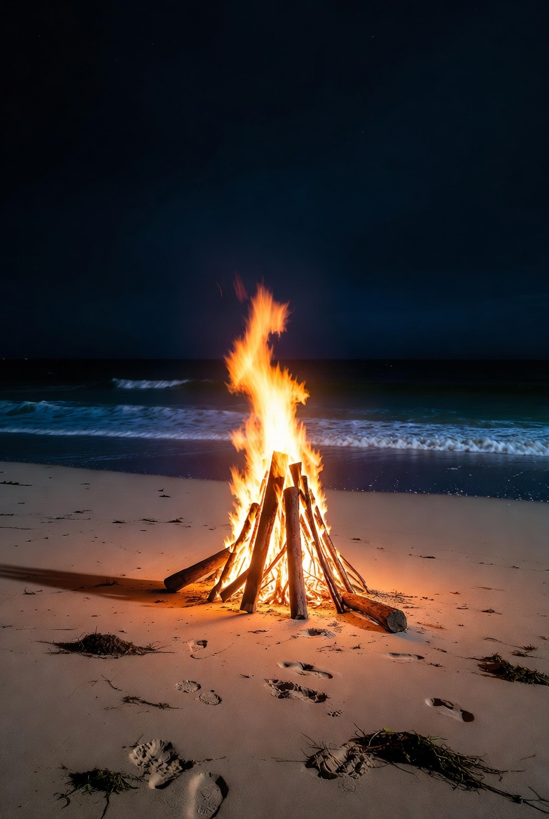 A tall bonfire with bright orange and yellow flames burns on a sandy beach during nighttime. Gentle waves crash nearby under a dark sky, and wooden logs form the fire's structure. Footprints and seaweed are visible in the sand around the fire.