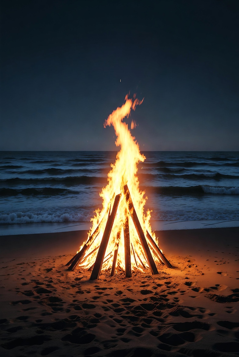 beach, beach bonfire, blaze, burning wood, campfire, coast, dark sky, fire, flames, footprints, logs, night, nighttime beach, ocean, outdoor fire, sand, sea, seaside fire, waves, bonfire