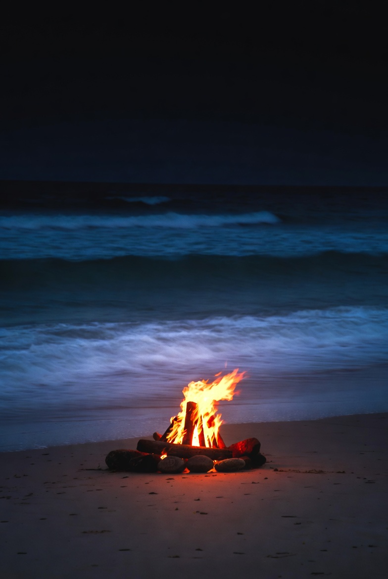 beach, beach fire, campfire, coast, dark sky, fire, flames, glowing embers, isolated background, logs, night, nighttime, ocean, sand, sea, seashore, waves, bonfire