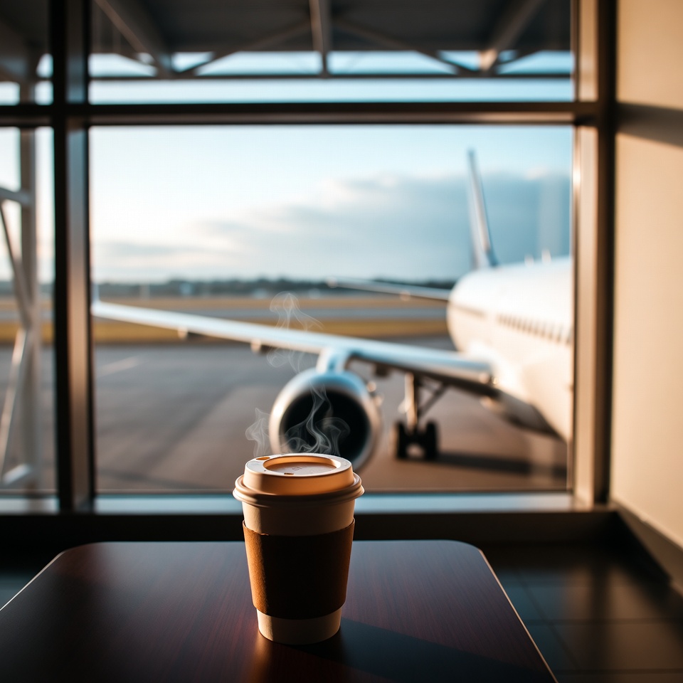 aircraft, airplane, airport terminal, airport window, aviation, clouds, disposable cup, exhaust fumes, jet plane, runway, sky, steaming coffee, travel, window view, wooden table, coffee cup