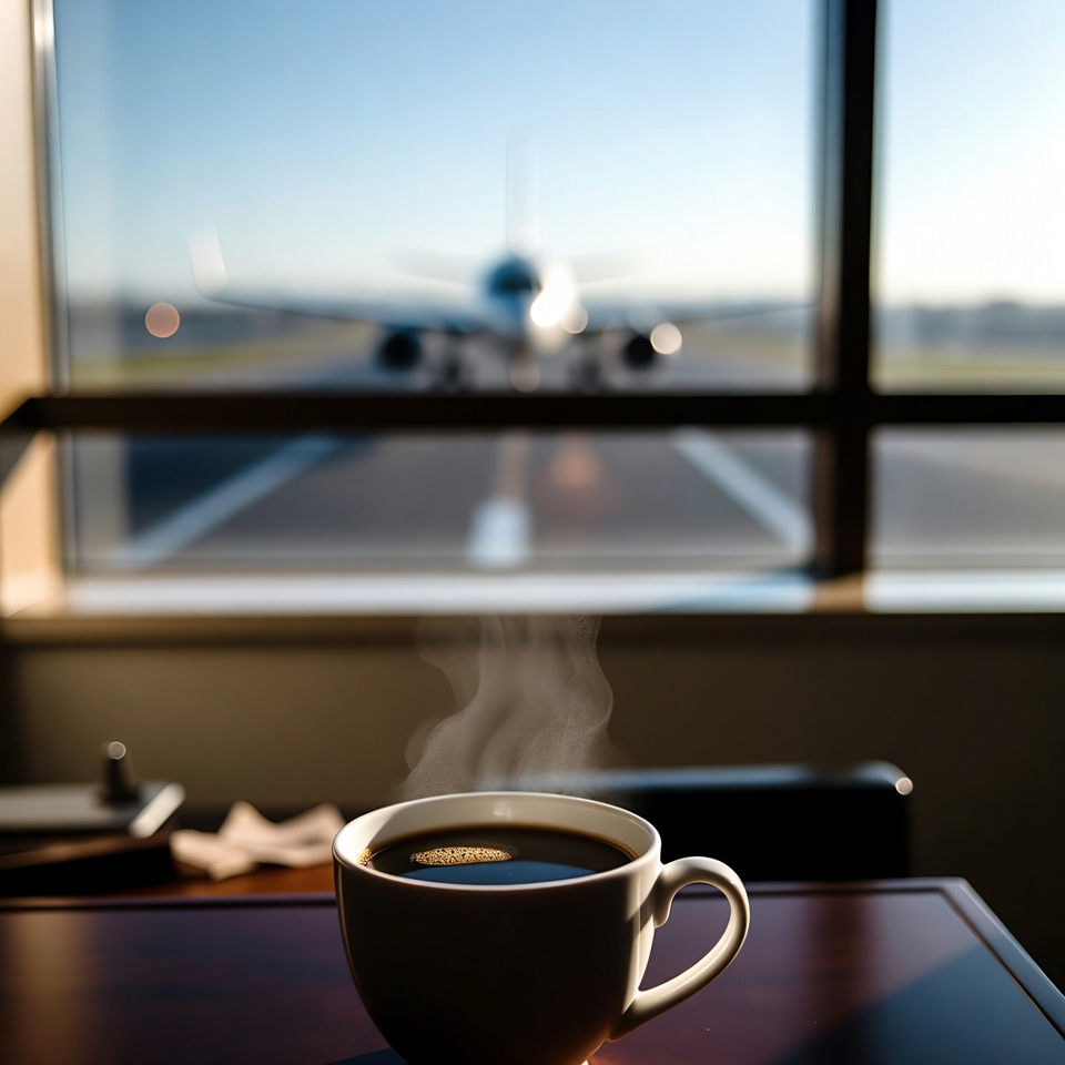 aircraft, airplane, airport, aviation, black coffee, coffee cup, glass window, hot beverage, morning coffee, napkin, office chair, runway, steaming coffee, sunset, terminal, travel, view, window, wooden table, coffee