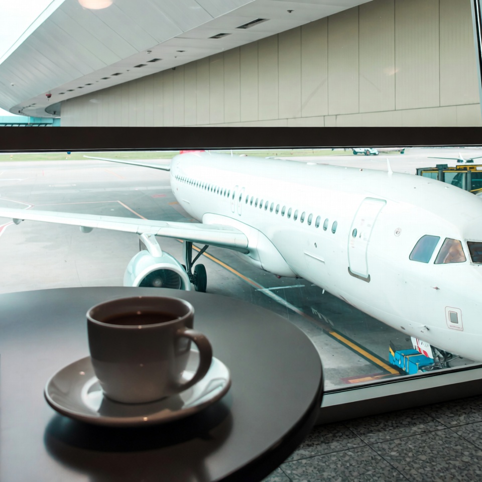 aircraft, airplane, airport terminal, airport window, aviation, gate area, jet bridge, passenger plane, round table, saucer, tarmac, white cup, white plane, window view, coffee cup