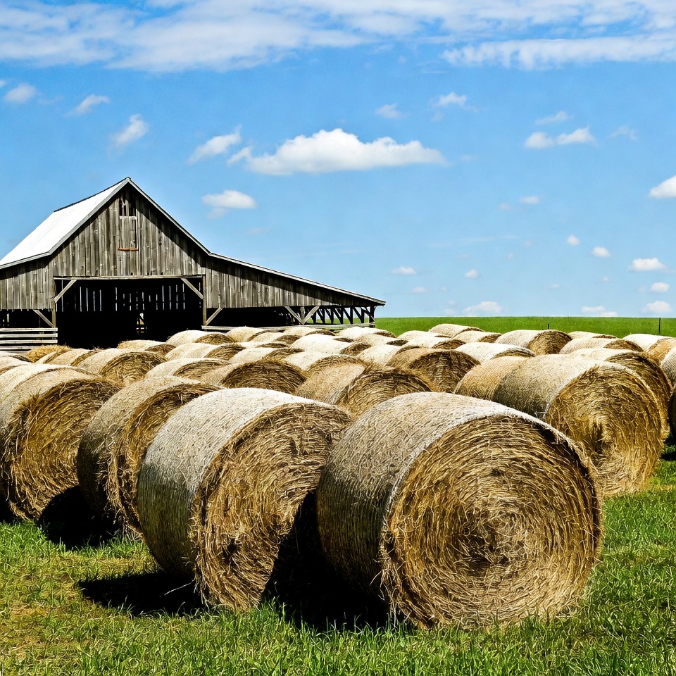 agriculture, barn, blue sky, clouds, countryside, farm, farm barn, farmland, field, grass, green field, harvest, hay field, haystacks, idyllic farm, landscape, nature, outdoor, pasture, round bales, rural, scenery, sky, straw bales, summer farm, wooden barn, hay bales
