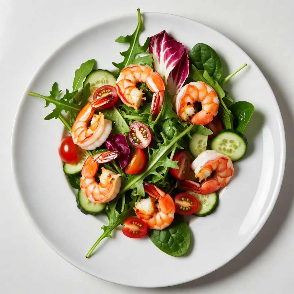 A fresh shrimp salad is arranged on a white plate viewed from above. It features pink cooked shrimp, arugula, spinach, radicchio, sliced cucumbers, and cherry tomatoes. The vibrant greens and reds create an appetizing display on a plain white background.