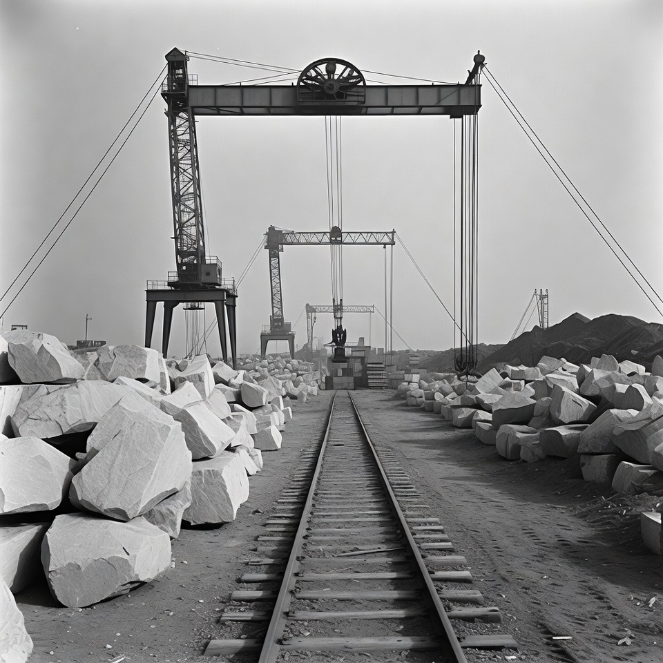 black and white, dockyard, gantry cranes, gravel piles, harbor, heavy machinery, industrial cranes, loading cargo, material handling, monochrome photo, outdoor industrial, piles of stones, port, quarry stones, railroad, railway track, rocks, shipyard, stone blocks, vintage photo, cranes