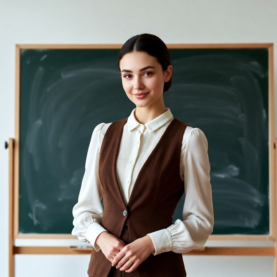 A young woman with dark hair in a bun stands confidently in front of a green blackboard in a classroom. She wears a white collared blouse under a brown vest with puffed sleeves and smiles at the camera. Her hands are clasped together in front of her.