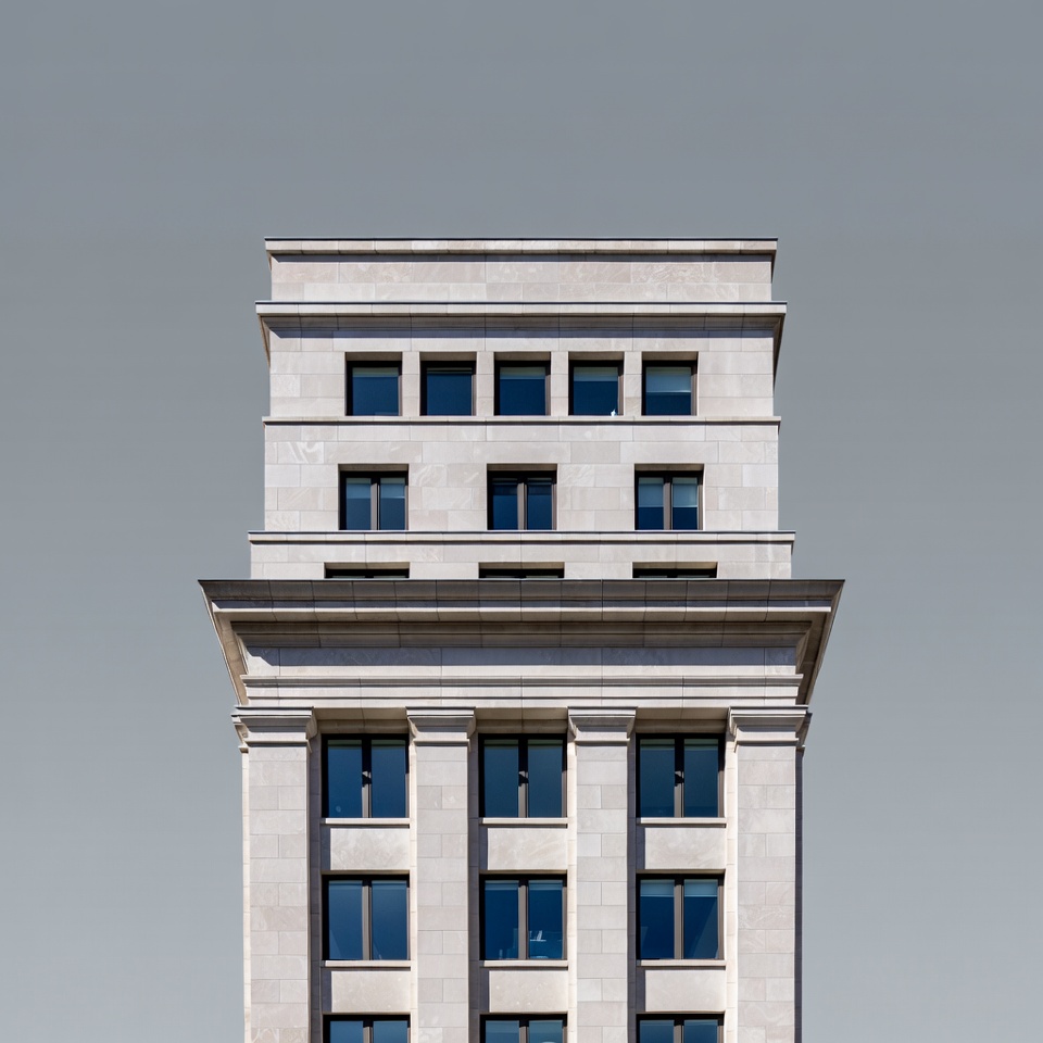 architecture, columns, cornices, dark frames, facade, high-rise, isolated background, modern architecture, rectangular windows, stone building, tall building, urban building, white stone, windows, building