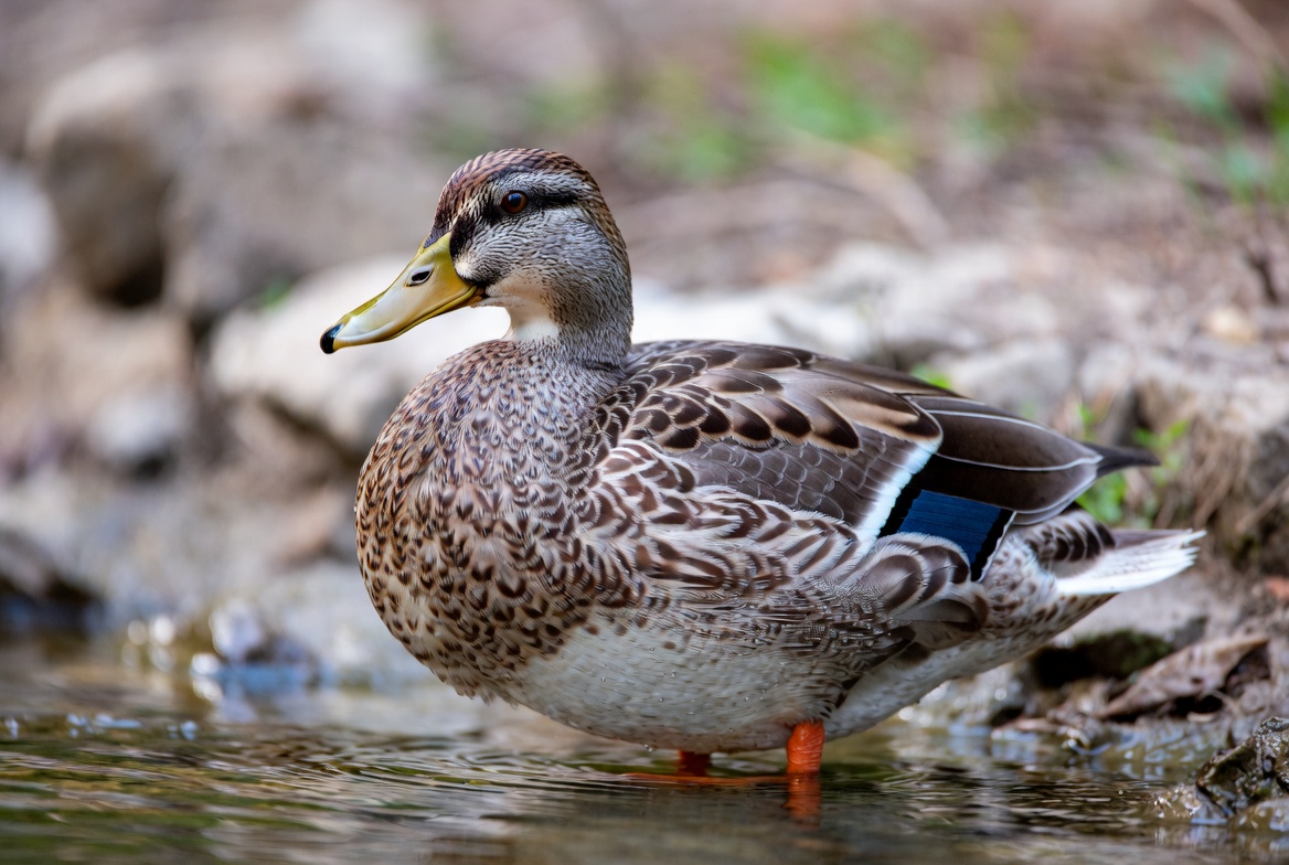 bird, blue wings, brown feathers, duck, feathers, green grass, green head, isolated background, male duck, nature, orange legs, outdoors, rocks, shallow water, standing duck, water bird, waterfowl, wildlife, yellow bill, mallard duck