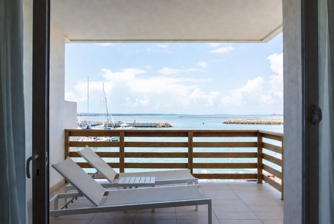 A spacious balcony with wooden railings and two white lounge chairs overlooks a sunny marina and turquoise ocean. Open glass doors frame the view of several sailboats docked at the pier with clear blue skies and scattered clouds above. The tiled balcony floor extends to the edge with sheer curtains on the doors.