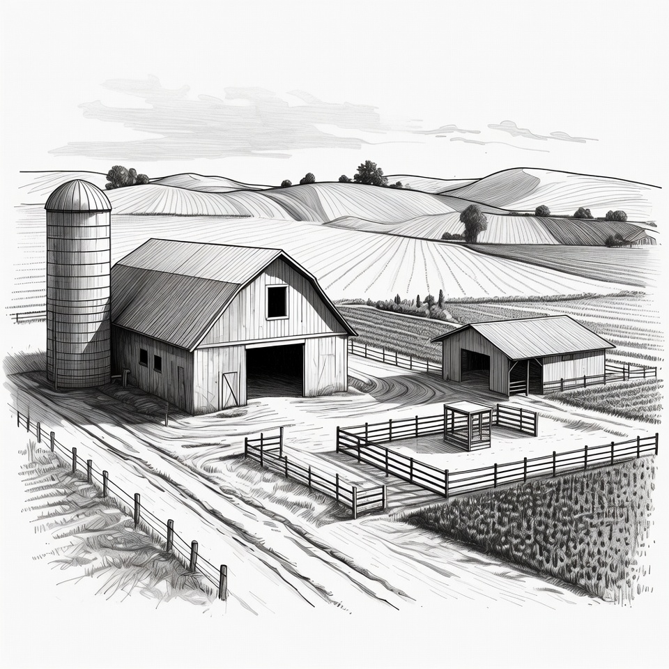 A detailed black and white line drawing depicts a rural farm scene with a large barn featuring a curved roof and open doors. A tall silo stands beside the barn, surrounded by fenced areas, paths, and fields of crops. Rolling hills and scattered trees fill the background under a clear sky.