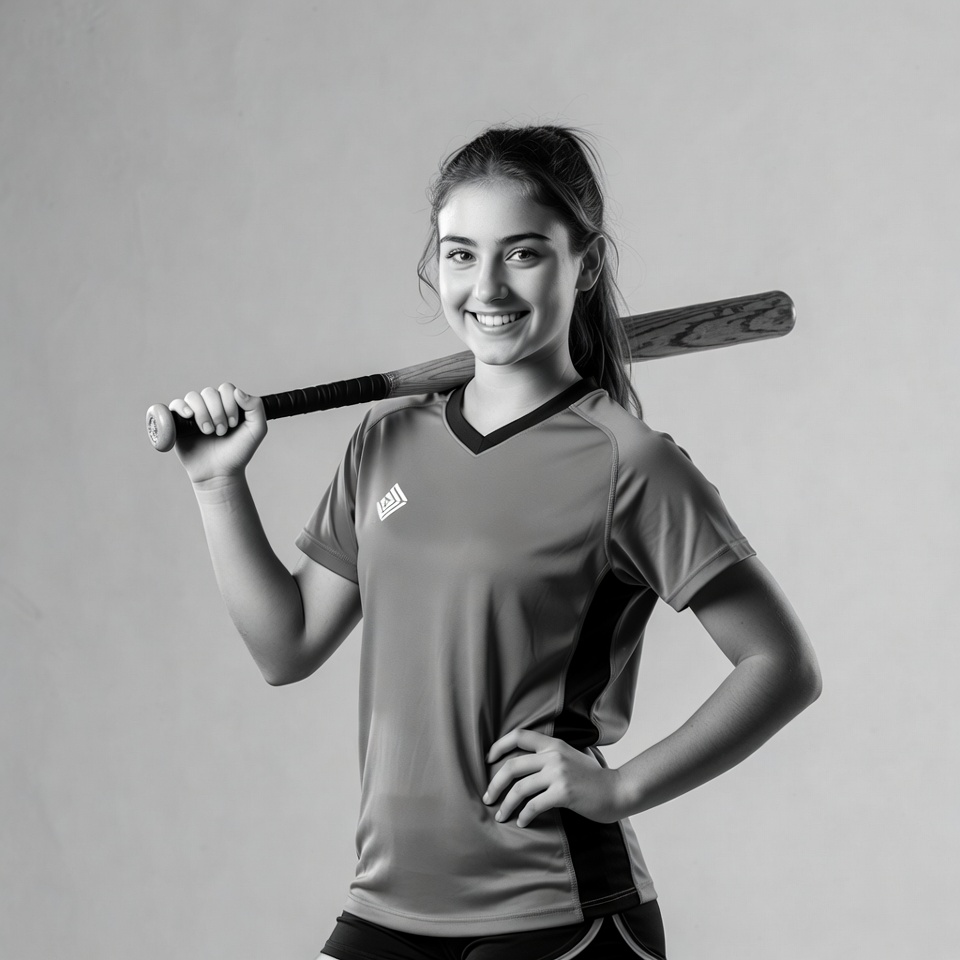 V-neck jersey, athlete, baseball bat, baseball player, black and white, black shorts, female, gray jersey, hand on hip, isolated background, monochrome, ponytail, portrait, short sleeves, smiling, sports jersey, sports uniform, wooden bat, young girl, girl