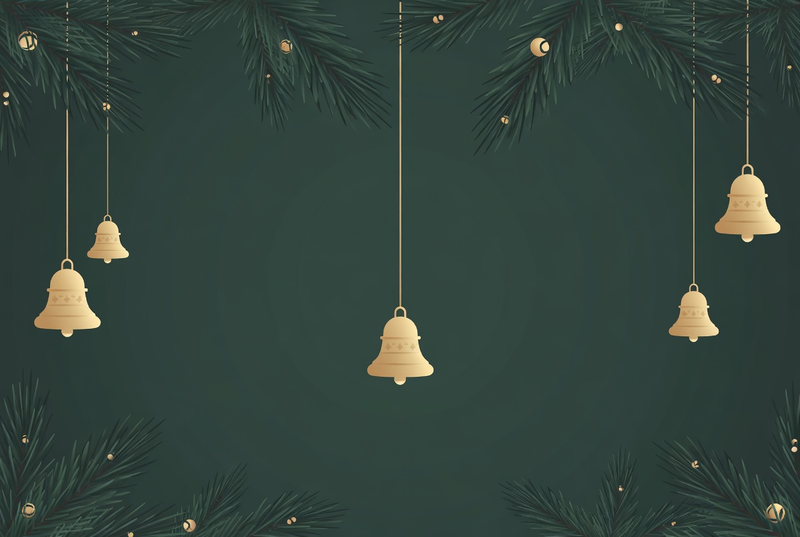 Golden jingle bells hang from strings against a dark green background decorated with pine branches and small golden ornaments. The bells are arranged in clusters, swaying gently amid the festive evergreen foliage. Sparkling lights and dots enhance the holiday theme.