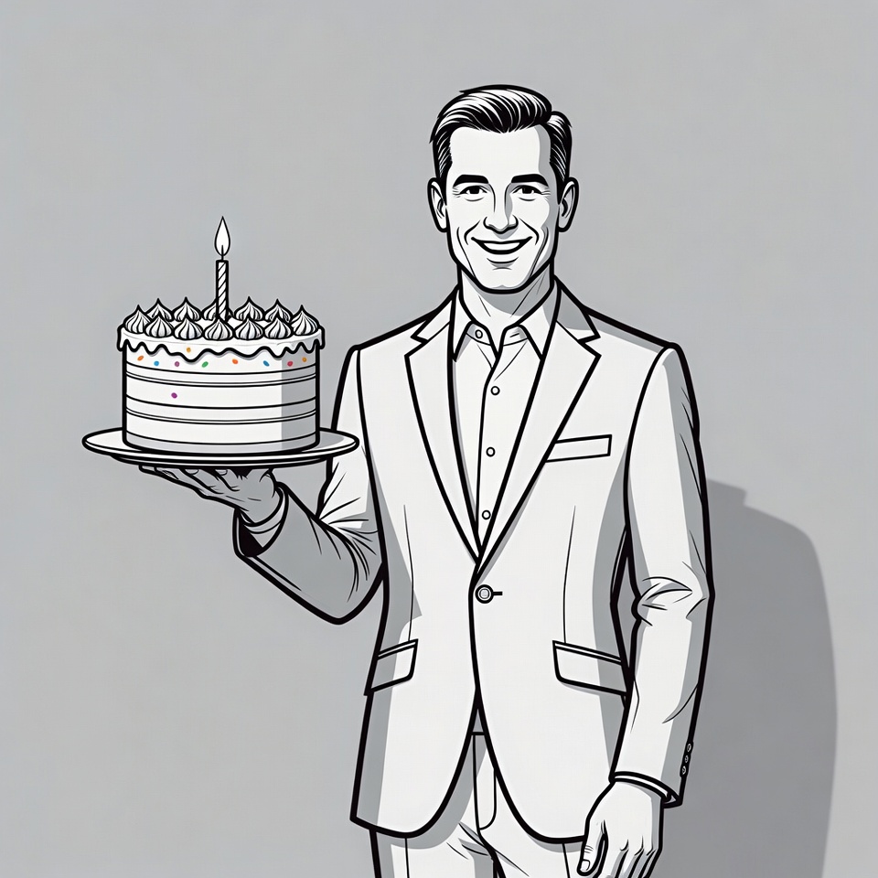 A smiling man in a suit holds a layered birthday cake with colorful frosting and a lit candle on a plain gray background. The illustration features bold black line art with white fill. He stands confidently presenting the cake on a plate.