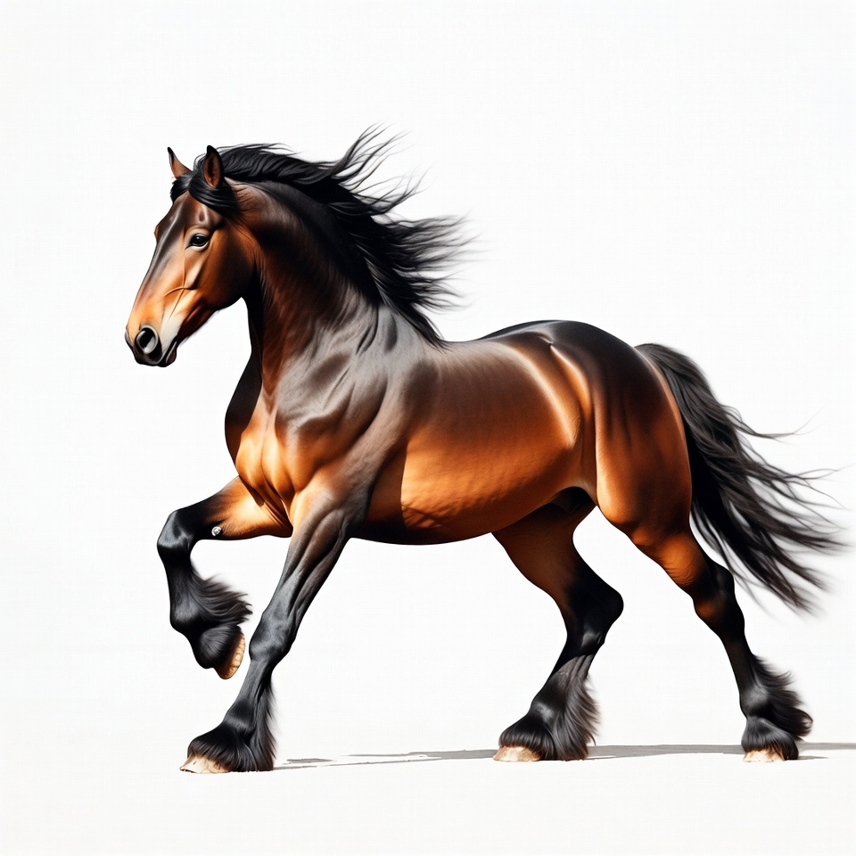 A majestic black Friesian horse with a flowing mane and tail gallops dynamically across a white background. Its muscular body shines with glossy highlights, and its hooves are lifted high in motion. The horse faces slightly to the side, showcasing its powerful legs and elegant form.