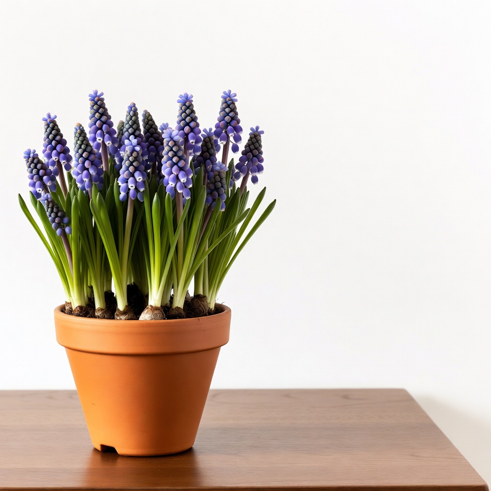 A cluster of vibrant purple hyacinth flowers grows from a terracotta pot on a wooden table. The flowers feature dense spikes of tiny blooms atop long green stems. The pot sits against a plain white background.