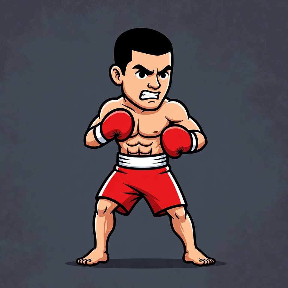 Latino, abs, angry face, boxer, boxing, boxing gloves, chibi style, clipart, combat sport, fighter, fighting stance, illustration, isolated background, man, muscular man, punch ready, red gloves, red shorts, shirtless, short black hair, tough guy, vector art, white waistband, cartoon