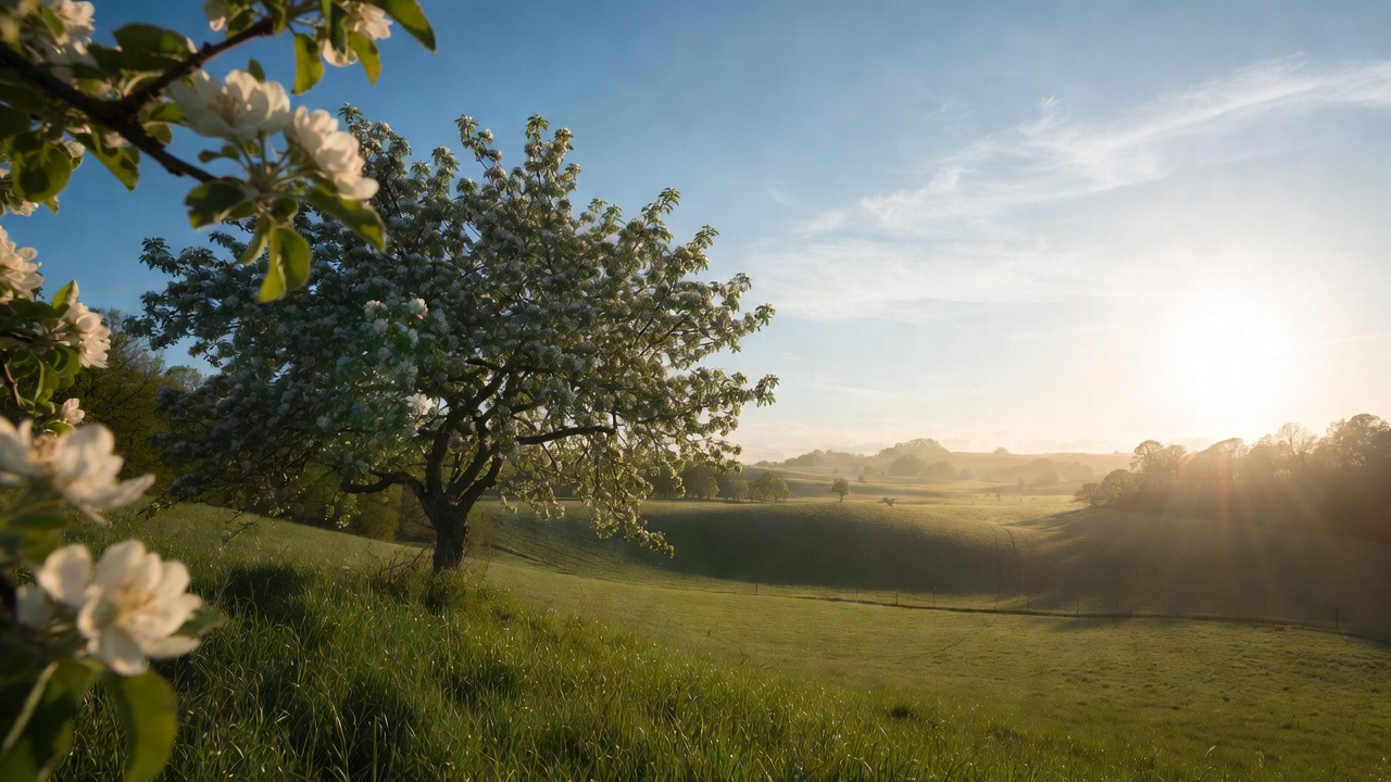 A cherry tree covered in white blossoms stands on a green grassy hill during sunrise. Sun rays filter through the branches, illuminating the rolling fields and distant hills under a clear blue sky. Fresh blossoms frame the foreground.