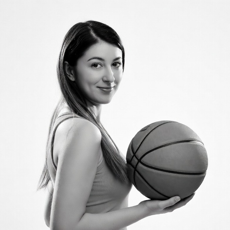 A young woman with long dark hair stands smiling while holding a basketball in her hands. She wears a tank top and poses against a plain white background. The image is in black and white.