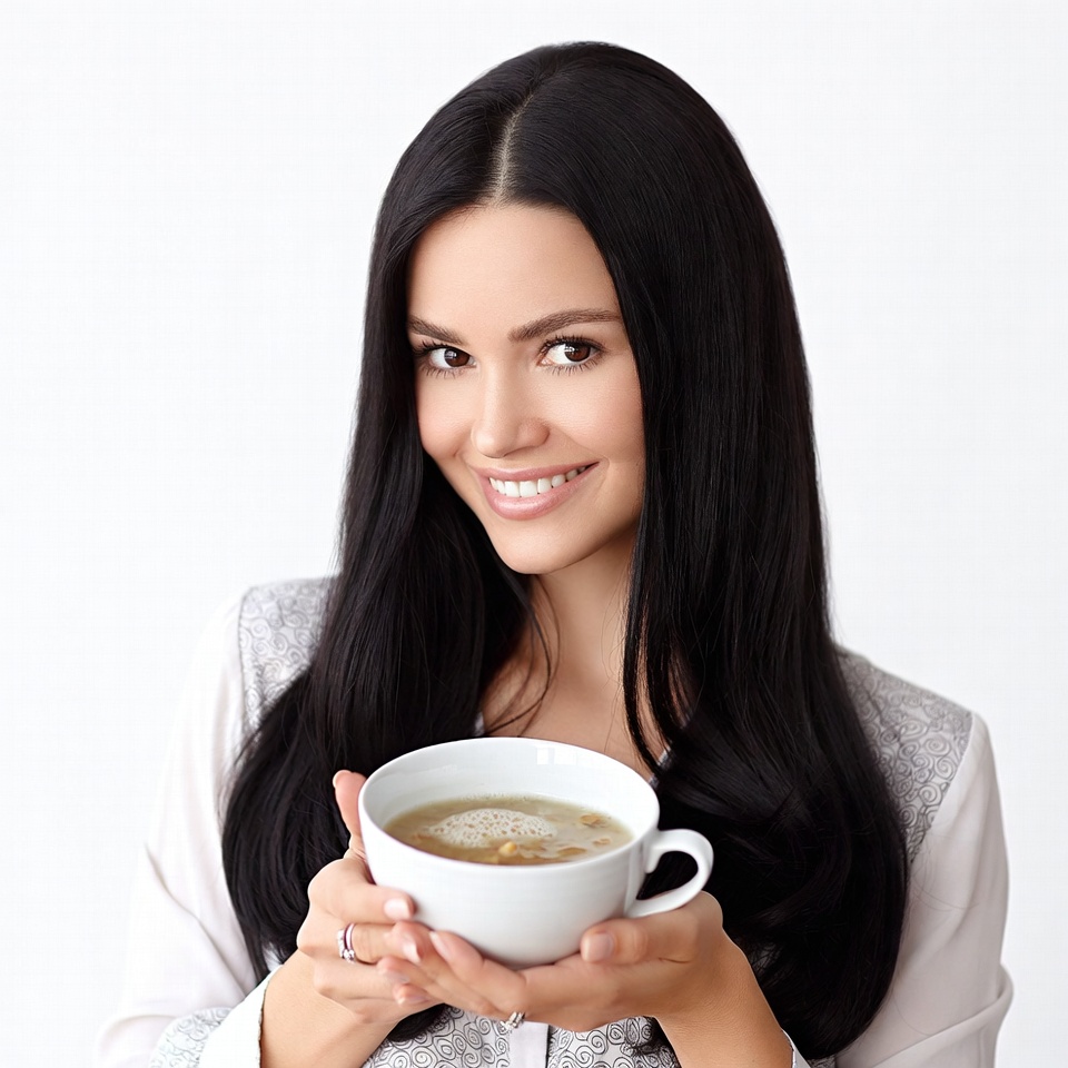 A woman with long black hair smiles while holding a white bowl of steaming soup with both hands. She wears a light gray blouse and stands against a plain white background. Her eyes look directly at the viewer with a friendly expression.