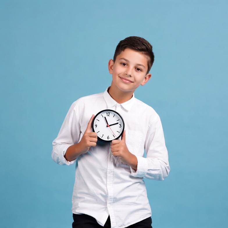 A young boy with short brown hair smiles while holding a black analog clock with white face in front of a solid blue background. He wears a white collared shirt and dark pants. His hands grip the clock firmly as he looks at the camera.