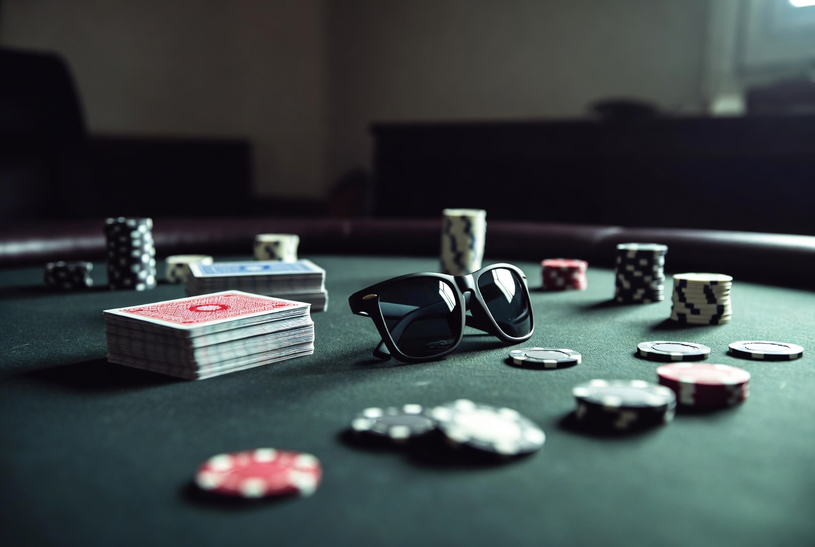 A green poker table holds stacks of colorful casino chips in red, blue, and black. A deck of playing cards sits beside a pair of black sunglasses. Scattered chips and cards create a casino gaming setup on a dark wooden table.
