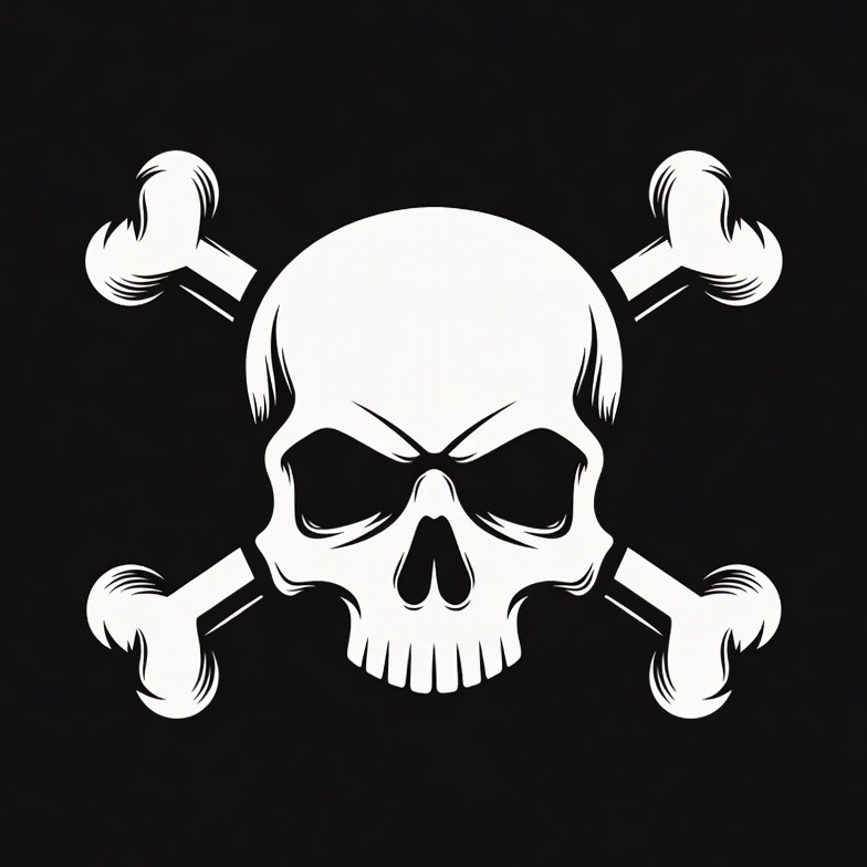 A white skull and crossbones symbol is illustrated on a black background. The skull features a menacing expression with prominent eye sockets and nasal cavity. The crossed bones are positioned diagonally beneath the skull.