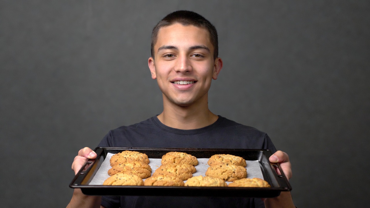 Latino, baked cookies, baking, baking tray, black tray, cookies, dark hair, dark t-shirt, food, fresh cookies, golden cookies, gray background, holding tray, male, pastries, short hair, smiling, t-shirt, young boy, boy