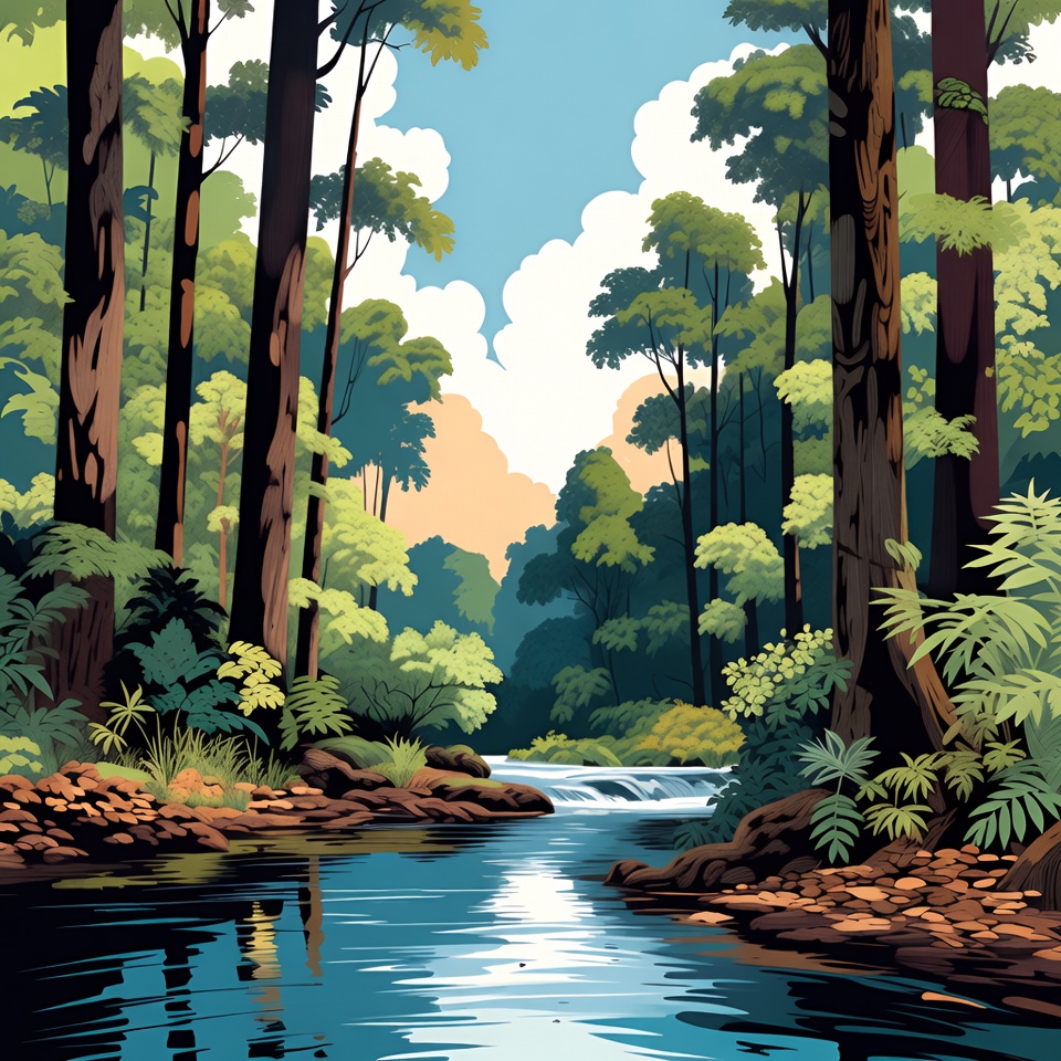 A vibrant vector illustration depicts a serene forest scene with tall trees surrounding a winding blue stream. Lush green foliage and ferns line the rocky banks, while fluffy clouds fill the sky above. The artwork features smooth gradients and bold outlines in a flat design style.