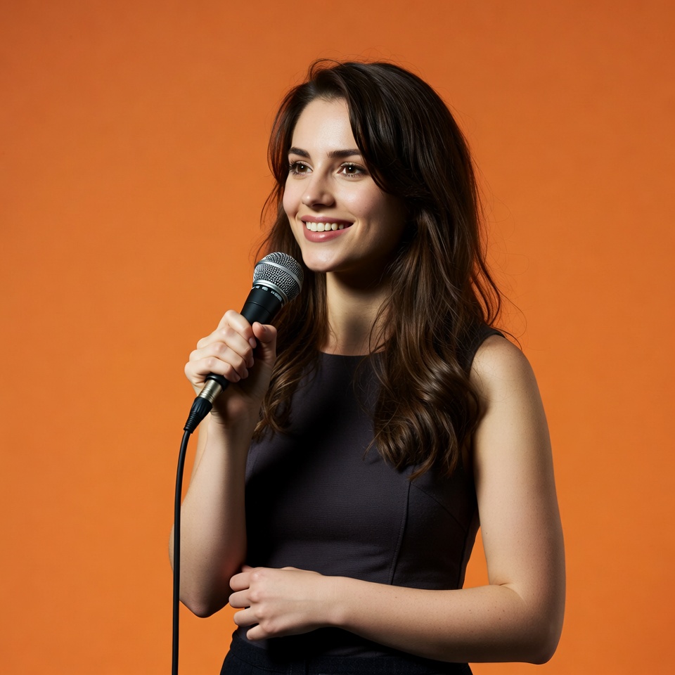 A young woman with long wavy brown hair holds a silver microphone close to her mouth against an orange background. She wears a sleeveless dark purple dress and smiles happily while performing. Her eyes are focused forward as she grips the mic stand with one hand.