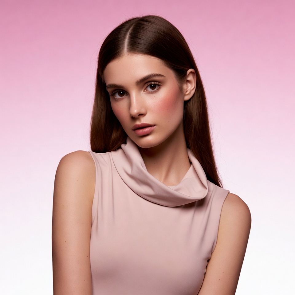White, beauty, blush, brown hair, closeup, cowl neck, female, headshot, long hair, makeup, pink background, pink top, portrait, serious expression, sleeveless top, straight hair, young woman, woman