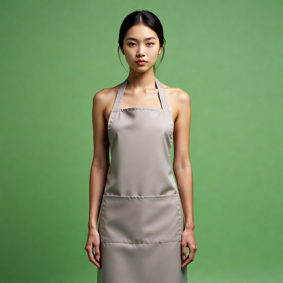 A young Asian woman with straight black hair in a bun stands against a solid green background. She wears a sleeveless gray apron with thin straps over her shoulders. Her arms hang naturally at her sides as she faces forward.