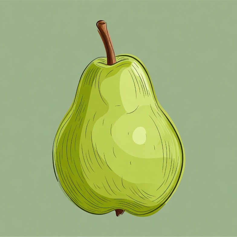 A vibrant green pear with a brown stem is illustrated in a hand-drawn style. It features smooth contours and subtle shading on a light green isolated background. The pear has a classic teardrop shape with highlights for a glossy appearance.