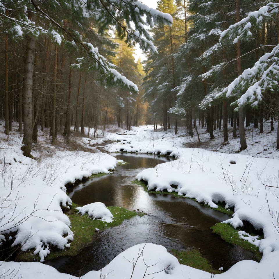 A serene winter forest features tall evergreen trees blanketed in snow. A narrow stream winds through the snowy landscape, reflecting the surrounding trees. Fresh snow covers the ground and branches, creating a pristine natural scene.