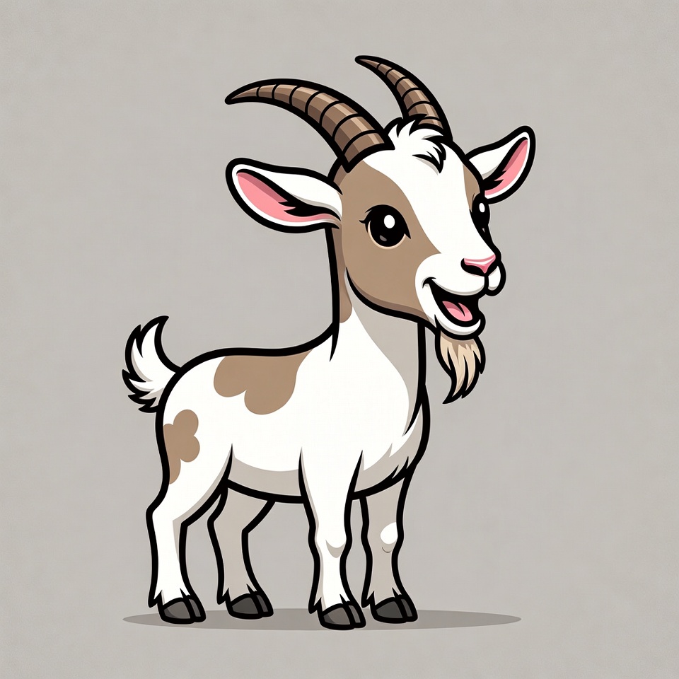 adorable animal, animal, baby goat, big eyes, brown fur, cartoon goat, clipart, cute goat, farm animal, floppy ears, fluffy tail, horns, illustration, isolated background, kid goat, smiling goat, vector art, white fur, goat
