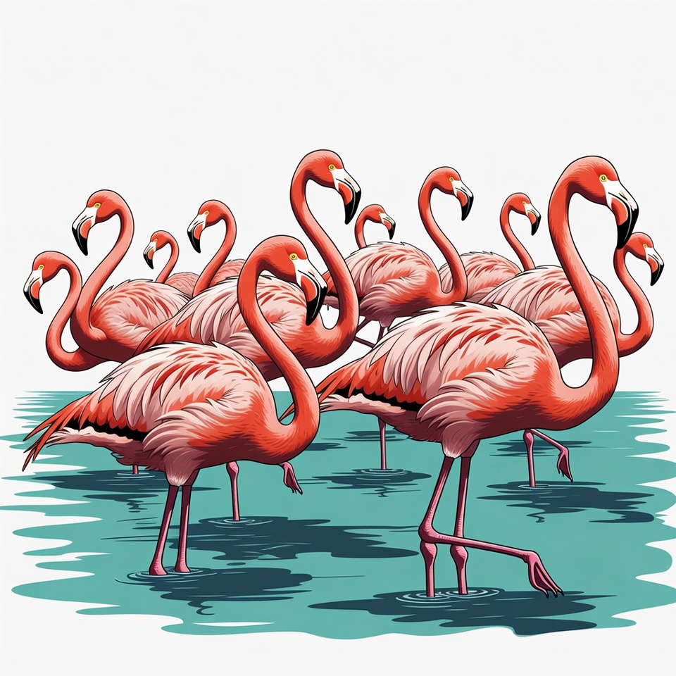 A vibrant illustration features a flock of pink flamingos standing together in shallow turquoise water. The birds have long necks, curved beaks, and fluffy feathers in shades of pink and white. They are depicted on a simple isolated background with water ripples.