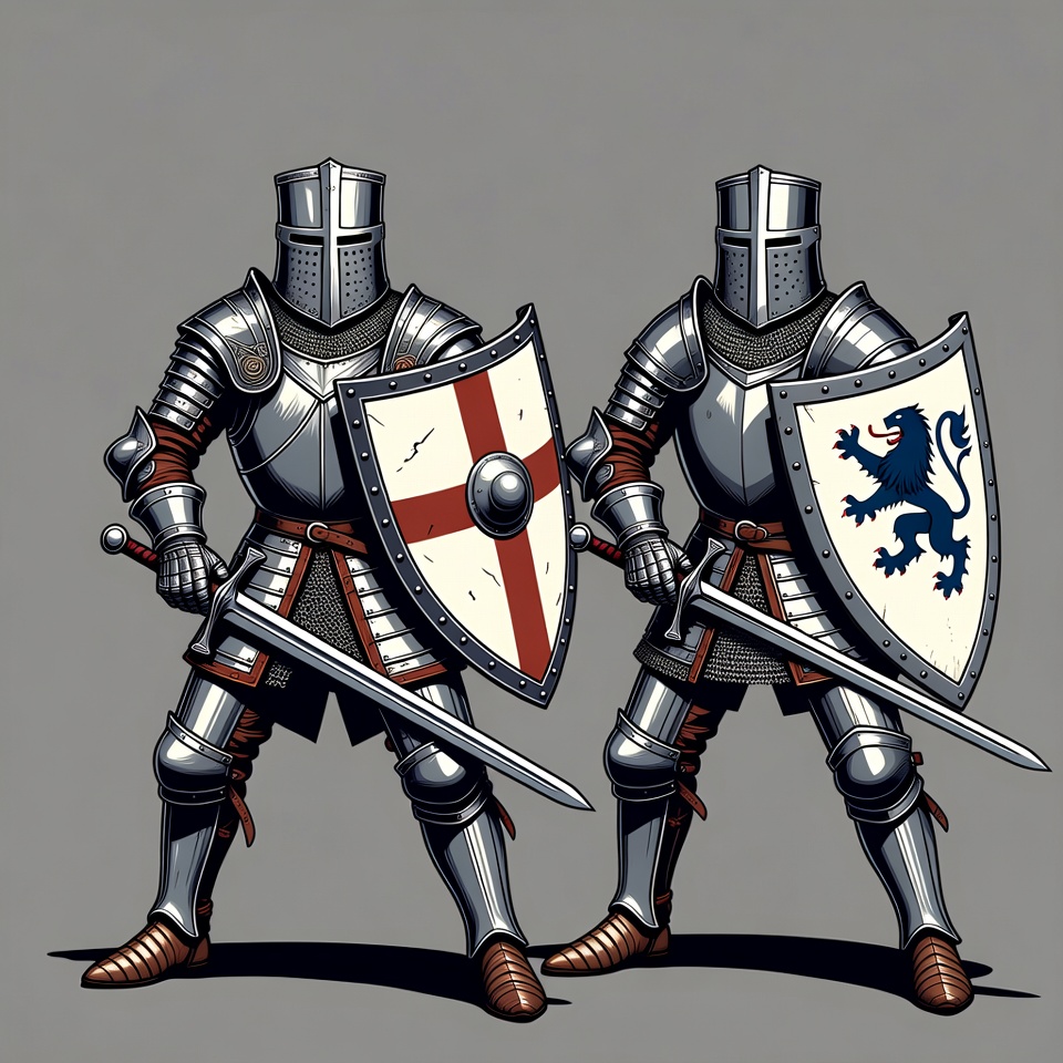 Two armored knights stand side by side on a gray background in a detailed illustration. The left knight holds a large white shield with a red cross and a sword, while the right knight carries a white shield featuring a blue lion. Both wear silver plate armor, helmets, and brown boots.