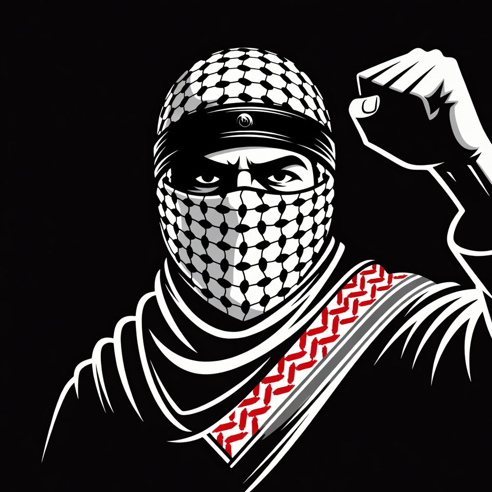 A stylized illustration of a man wearing a black and white keffiyeh scarf with red accents, covering his face and head. He raises his right fist assertively against a black background. His intense eyes are visible above the mask, rendered in bold black and white graphic style.