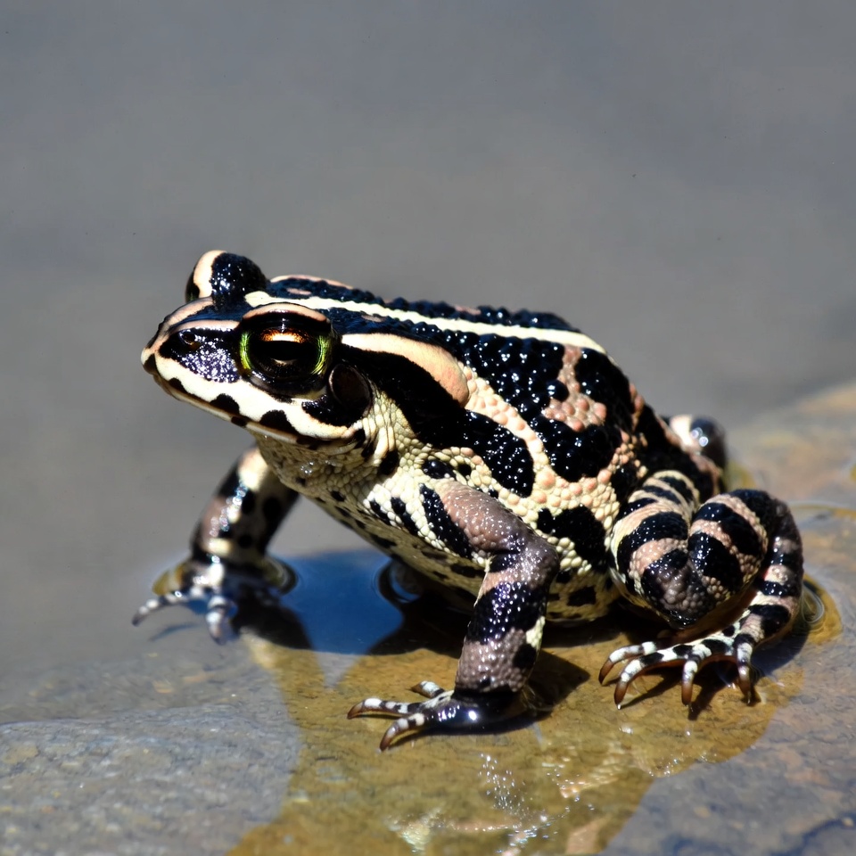 A toad with black and yellow striped patterns sits on a wet rock near shallow water. Its green eyes and textured skin are prominent, with claws visible on its legs. Sunlight reflects off the surrounding water.