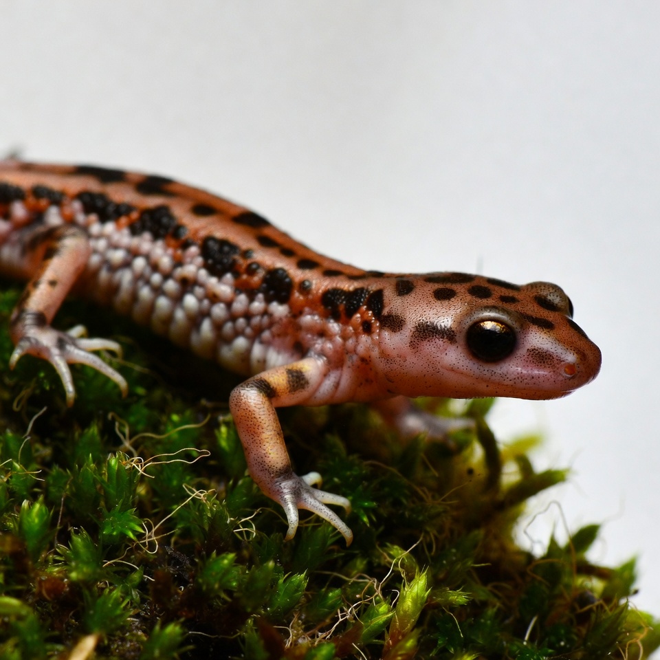 A spotted salamander with orange skin and black spots crawls on green moss. Its belly is light-colored with granular texture, and it has large dark eyes. The amphibian is positioned on a white background with moss underneath.