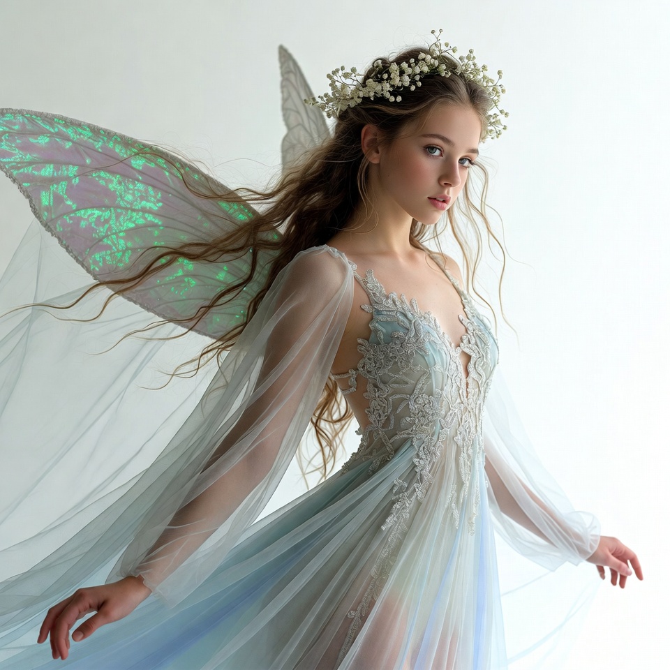 A young woman with long wavy hair wears a delicate white lace gown and a floral crown. She has large iridescent fairy wings in shades of purple and green extending from her back. She poses gracefully against a plain white background.