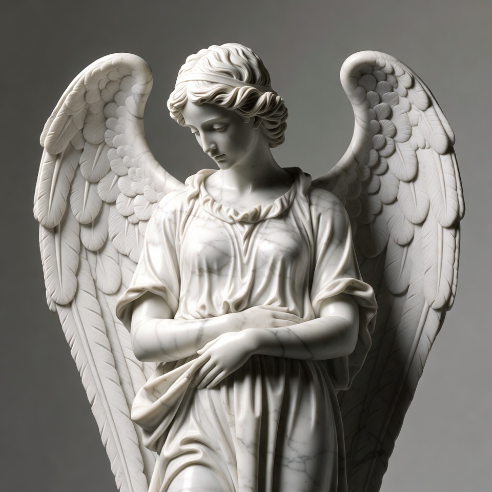 angel wings, angelic figure, art, classical sculpture, curly hair, draped gown, feathered wings, female angel, hands clasped, isolated background, marble sculpture, mythology, religious art, sculpture, serene expression, stone angel, white marble, winged figure, angel statue