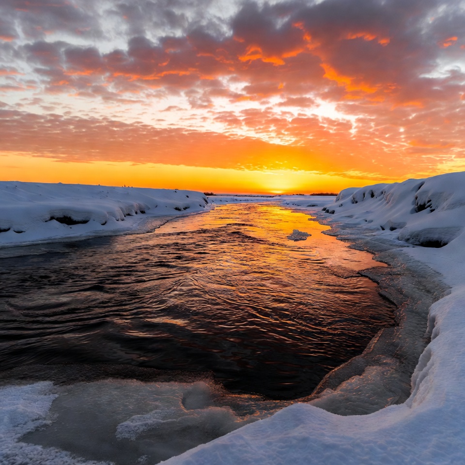 A vibrant sunset with orange and red skies illuminates a narrow river flowing through snow-covered banks. The water reflects the golden sunlight amid patches of ice along the edges. Snowy landscapes frame the serene winter scene.
